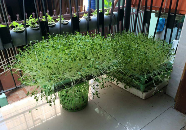 Trong nhà, anh Phong tận dụng lối đi cầu thang để trồng rau mầm.